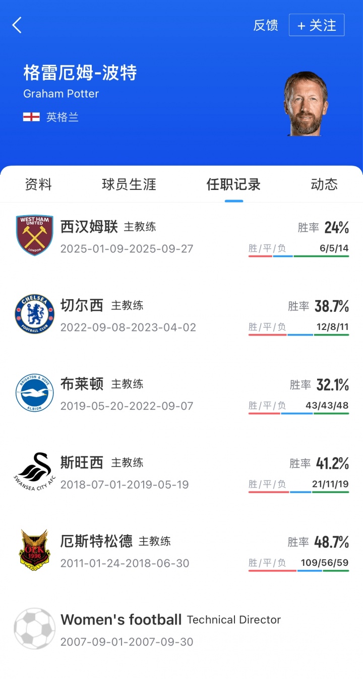波特现年50岁,此前曾捏教过斯旺西、布莱顿、切尔西,本赛季波特在西汉姆开局战绩欠安,前5轮1胜4负,9月27日被受命。