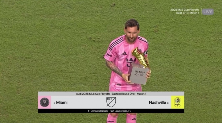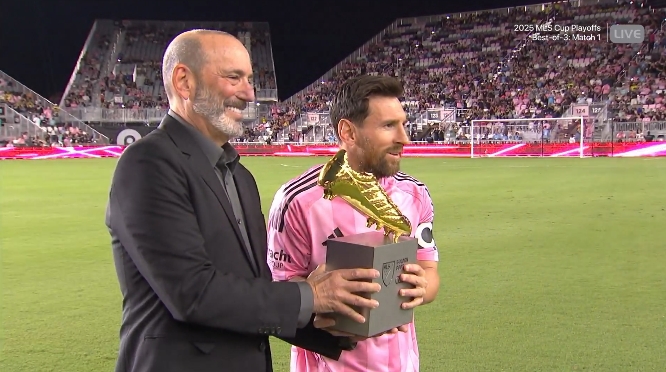 先领个金靴!季后赛首轮开场前,梅西领取惯例赛金靴奖杯