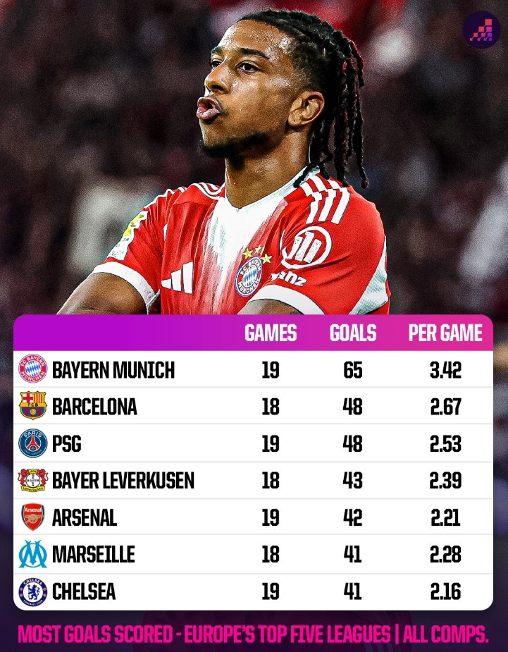 本赛季五大联赛球队进球榜:拜仁19场65球居首,巴萨48球次席
