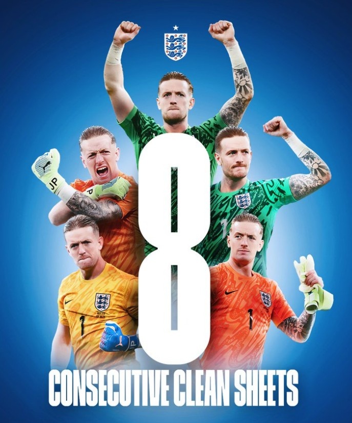 皮克福德担任英格兰首发门将,匡助球队完成零封,他连结8场出战90分钟的国度队比赛齐完成零封,英格兰男足门将历史首东谈主。本日英格兰官方发布海报道贺皮克福德。