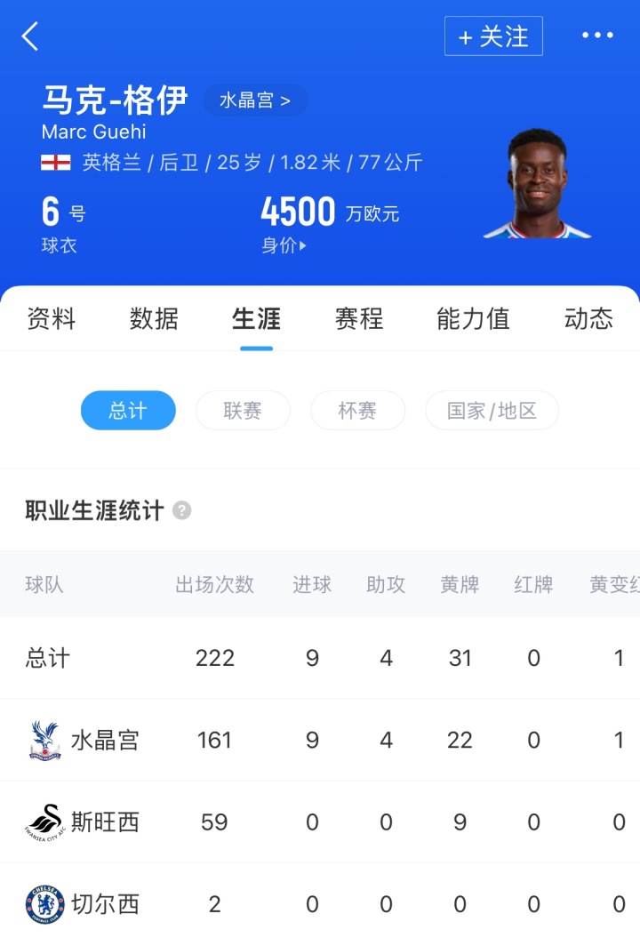 现年25岁的格伊出自切尔西青训,2021年夏天他以2334万欧的转会费加盟水晶宫。于今为水晶宫出战161场孝敬9球4助。本赛季格伊仍是代表水晶宫出战3轮英超,况且在本轮比赛轰入1粒精彩的天下波。咫尺其德回身价为4500万欧。