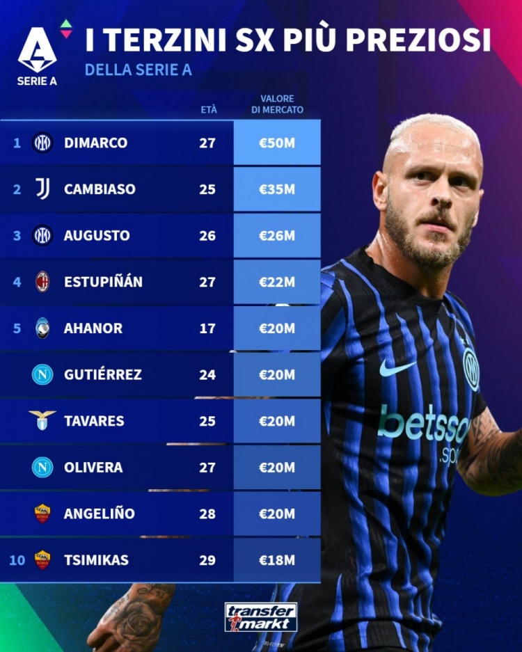 德转清点意甲左后卫身价名次:迪马尔科5000万欧居首