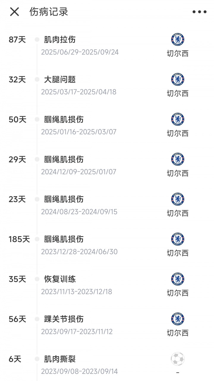 21岁拉维亚自2023年8月18日加盟切尔西以来,一共受伤9次,总天数累计503天,错过了77场比赛,2年多以来策画只为切尔西出战30场比赛,0球1助。他的伤情主若是腘绳肌和拉伤。