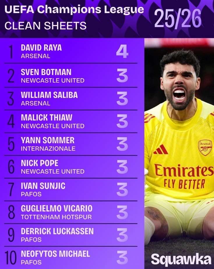 本赛季欧冠零封场次榜:拉亚4场居首,萨利巴、索默在列