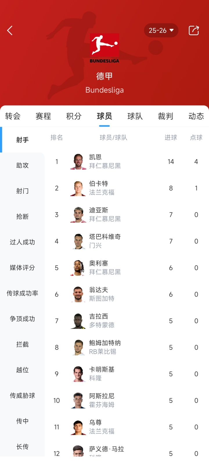 德甲弓手榜:凯恩12场14球遥遥擢升,前五拜仁占据三席
