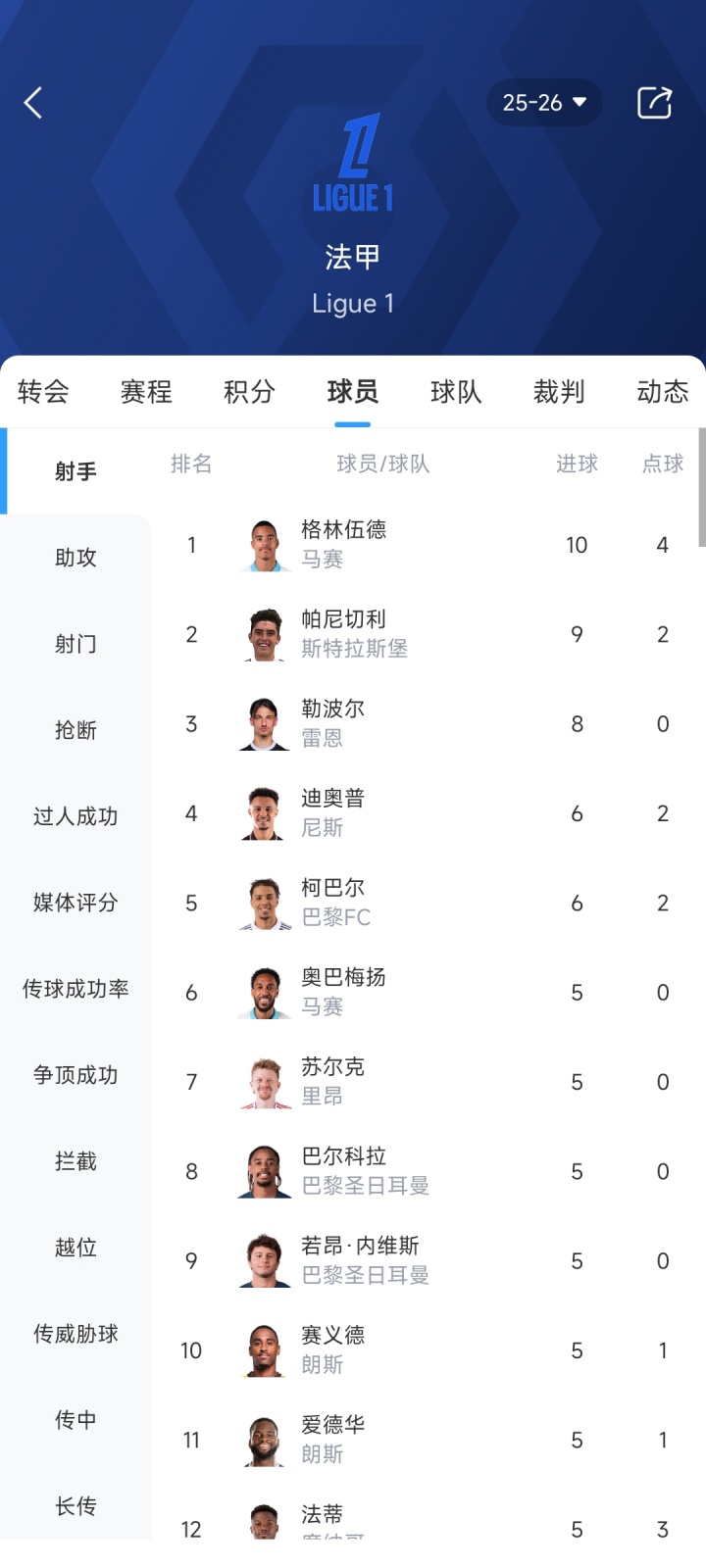 法甲弓手榜:24岁格林伍德10球领跑,23岁帕尼切利9球步步紧逼