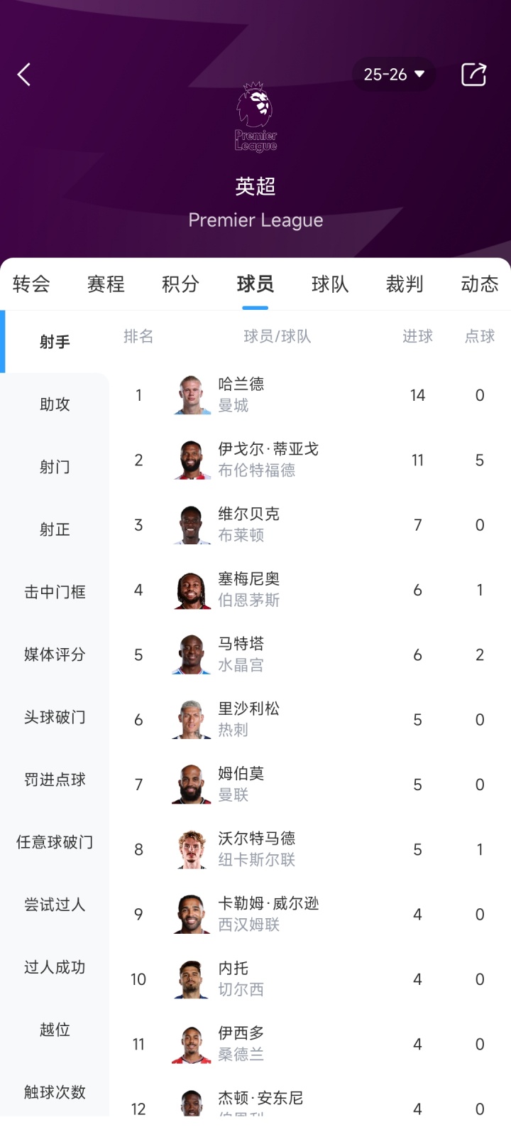 英超弓手榜:哈兰德13场14球一花独放,伊戈尔·蒂亚戈11球异军突起
