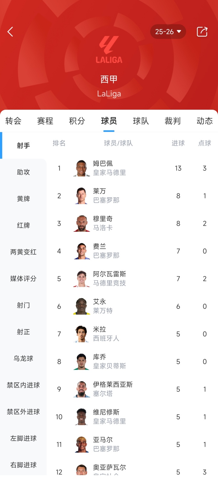 西甲弓手榜:姆巴佩13场13球强势领跑,莱万8球位居第2