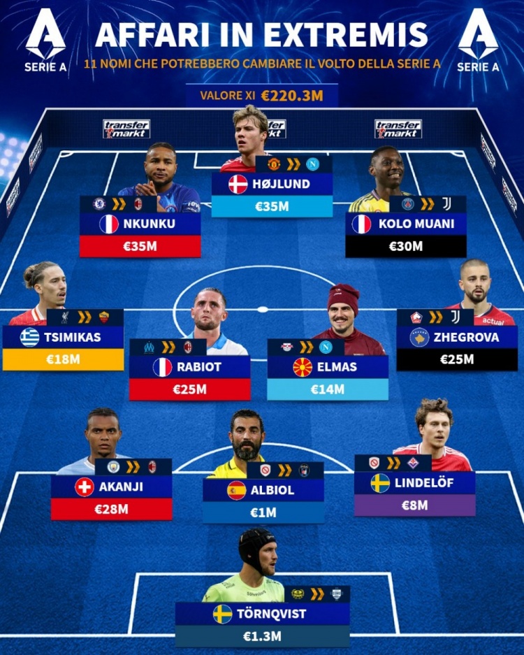 8月28日讯 德转官推当天更新,清点了在今夏转会适度日前潜在加盟意甲联赛的球员,并将这些球员以3-4-3的阵形列举出来,其中霍伊伦、恩昆库、穆阿尼等在列。