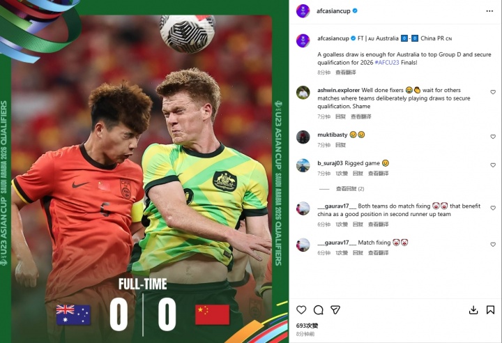 外网球迷挑剔国足0-0澳大利亚:真可耻!两队一说念踢了场假球🤡