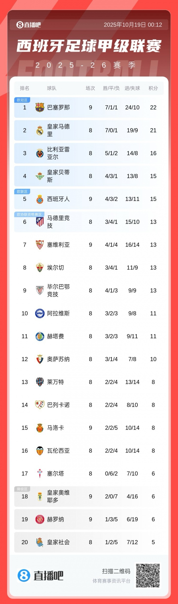 西甲积分榜:巴萨先赛暂升榜首级先皇马1分,皇马明日客战赫塔费