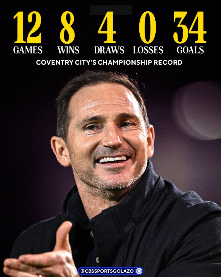 呼吁大进!兰帕德率考文垂豪取6连胜,8胜4平进34球不败领跑英冠