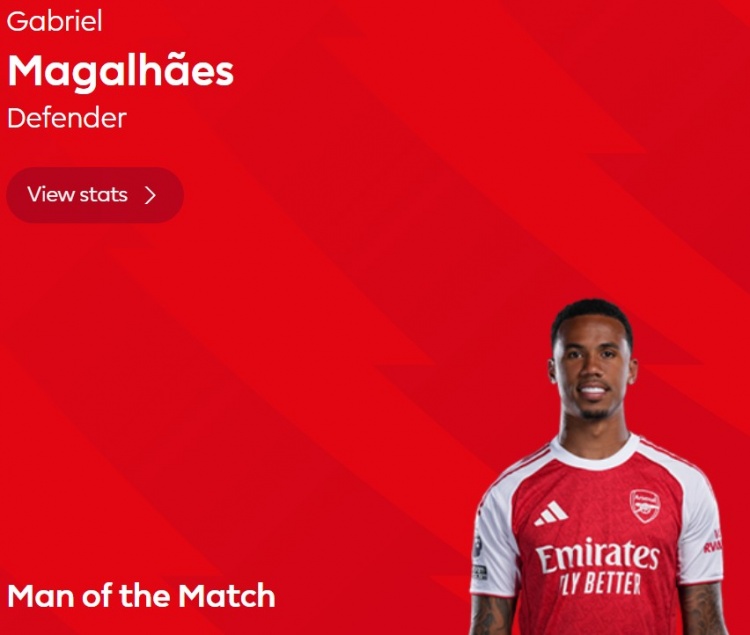 本场比赛加布里埃尔首发出战进展持重,,孝敬6次突围,赛后他也当选英超官方球迷票选全场最好球员。