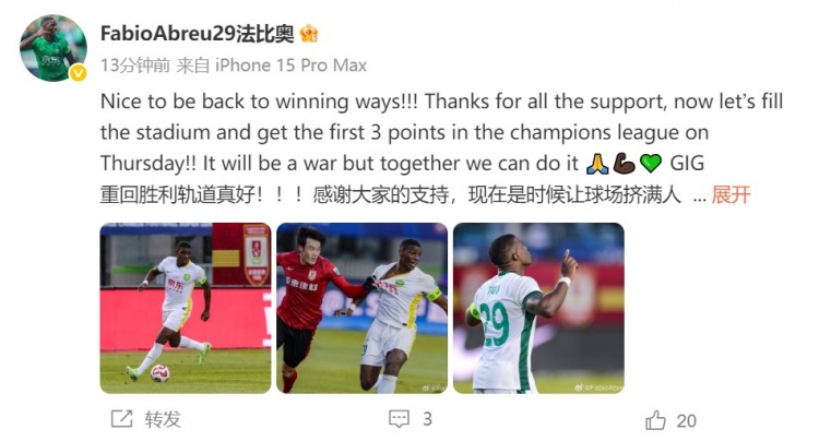 11月3日讯 国安球员法比奥更新社媒,庆祝球队本轮赢球。