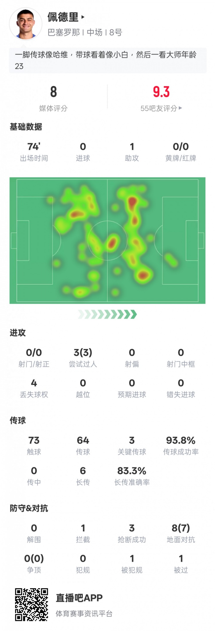 佩德里本场数据:1助攻3关节传球3过东说念主奏效,评分8.0