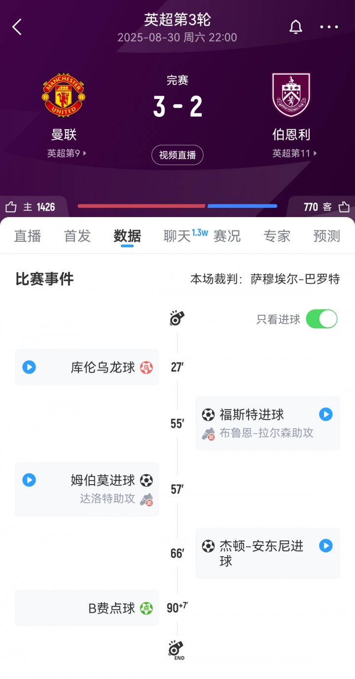论剧情还得看曼联!曼联两度越过被升班马追平 B费补时点射救赎!