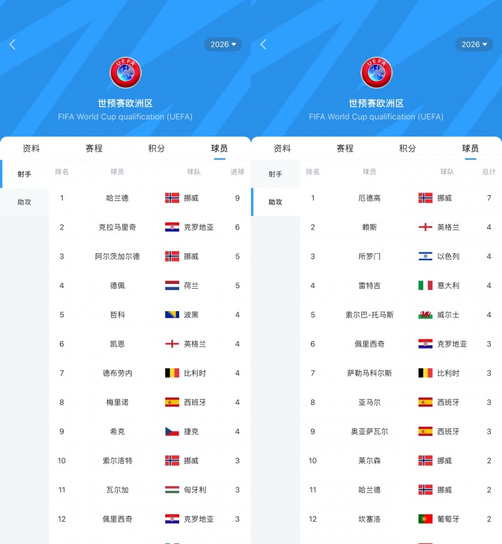 世欧预球员数据榜上,哈兰德9球领跑弓手榜,比第二克拉马里奇多3球,厄德高7助攻领跑助攻榜,比第二赖斯多3次助攻。