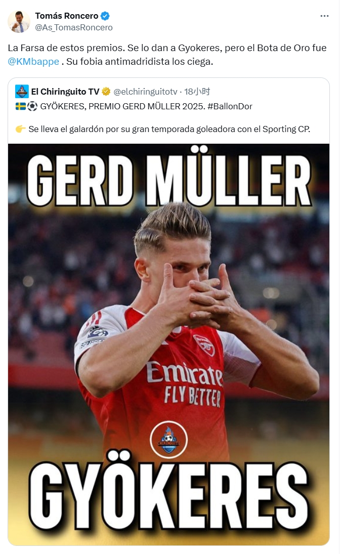 09月23日讯 金球奖受奖庆典后,《阿斯报》副主编、闻明皇马球迷龙赛罗质疑了颁发给阿森纳时尚约克雷斯的盖德-穆勒奖。