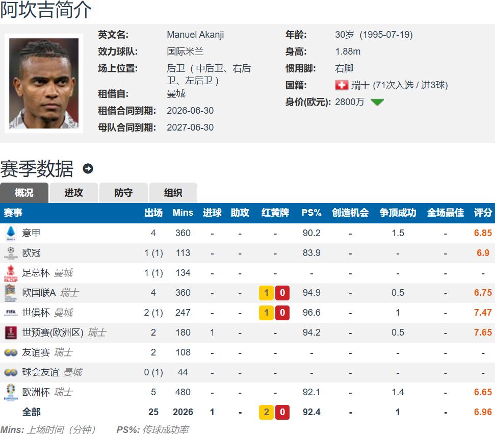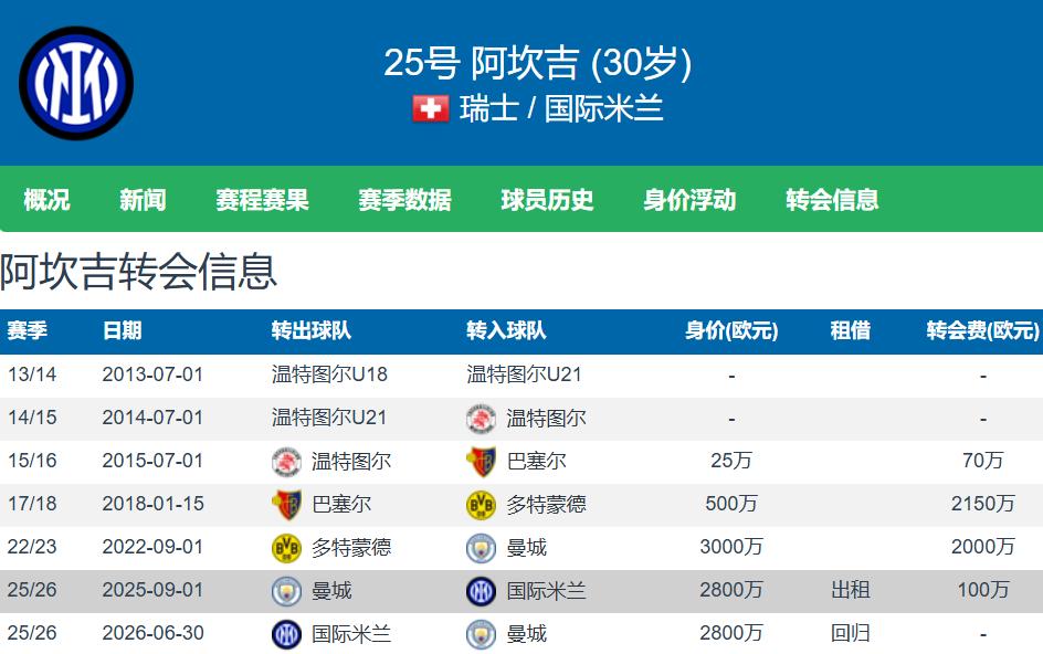 阿坎吉于2022年夏窗以2000万欧元的转会费从多特蒙德加盟曼城,蓝月生计136场5球3助,随队夺得1次欧冠、2次英超、1次世俱杯、1次足总杯冠军。阿坎吉于本年夏窗以100万欧元的租赁费加友邦际米兰1年,合同含有1500万欧元的选拔性买断条件。