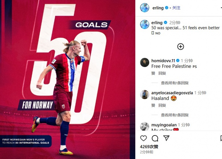 哈兰德在社媒配文中写说念:“第50球很非凡……但第51球的嗅觉会更好😉🇳🇴”