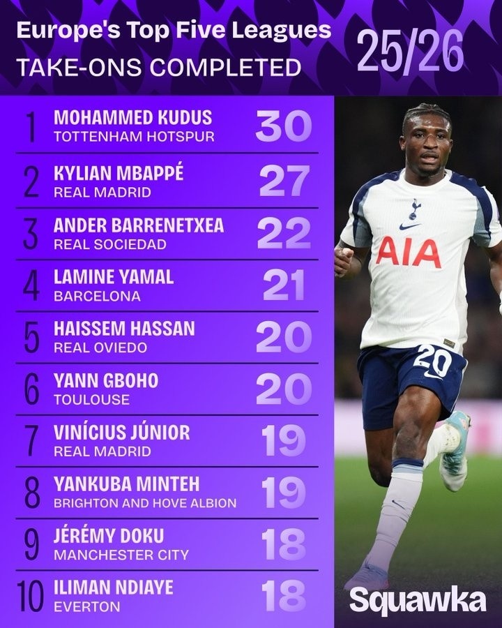 谁最能过东说念主?五大联赛过东说念主榜:库杜斯30次序1!姆巴佩2亚马尔4