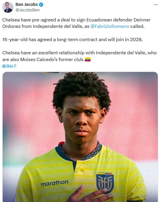 11月15日讯 据记者Ben Jacobs报谈,切尔西预签厄瓜多尔16岁天才后卫奥多涅斯(Deinner Ordonez)杀青公约,这名小将照旧获取一份长久合同,他将于2028年1月崇敬加盟。