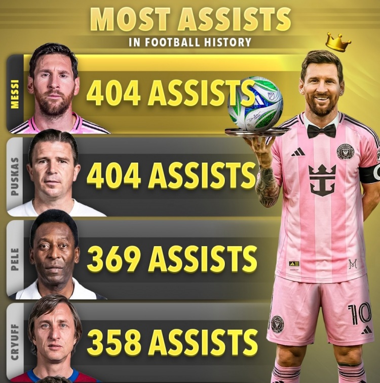 11月24日讯 好意思职联比赛,梅西1射3助指引迈阿密4-0完胜辛辛那提,晋级东部决赛。至此,梅西已作事生计助攻数已达404次。据score90数据统计,梅西404次助攻已追平普斯卡什,两东谈主并排天下足坛助攻榜榜首。