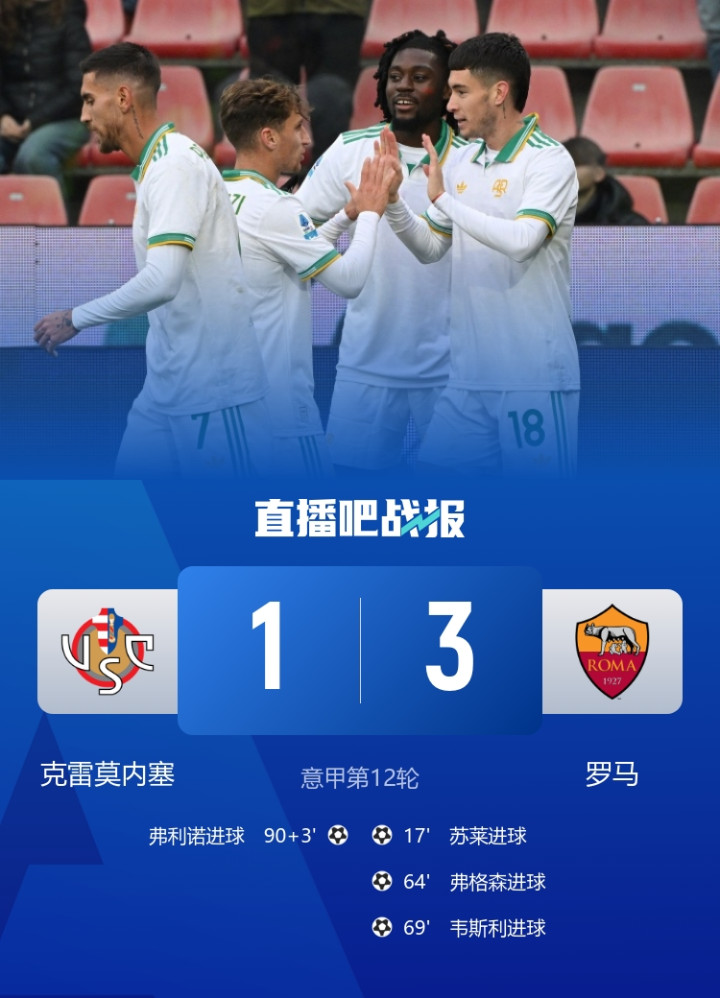罗马本轮3-1打败克雷莫内塞,苏莱、韦斯利破门,弗格森终于获利处子球。