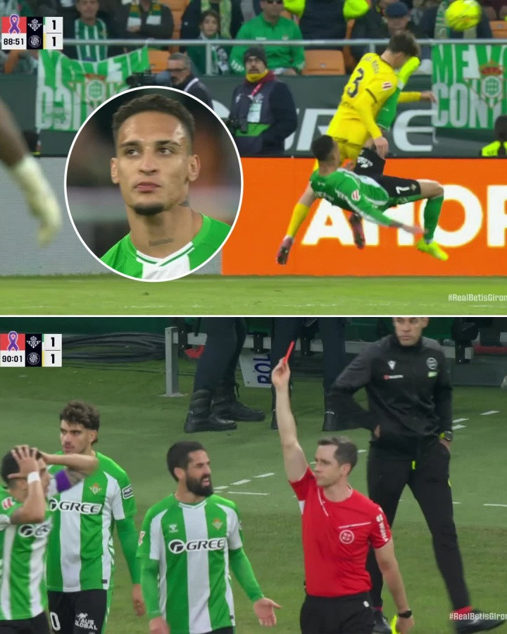 贝蒂斯本轮1-1战平赫罗纳,第90分钟,安东尼一个倒勾当作踢到敌手头部,被直红罚下。