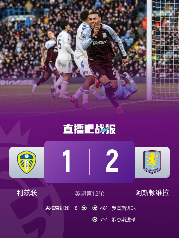 维拉本轮英超2-1打败利兹联,罗杰斯双响,其中包括一粒轻易球径直破门。