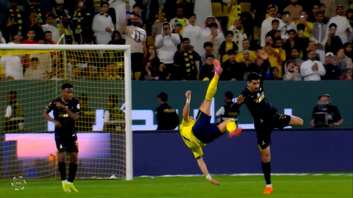 利雅得胜利主场迎战赛哈特海湾,C罗打进一粒超等倒勾,精彩!