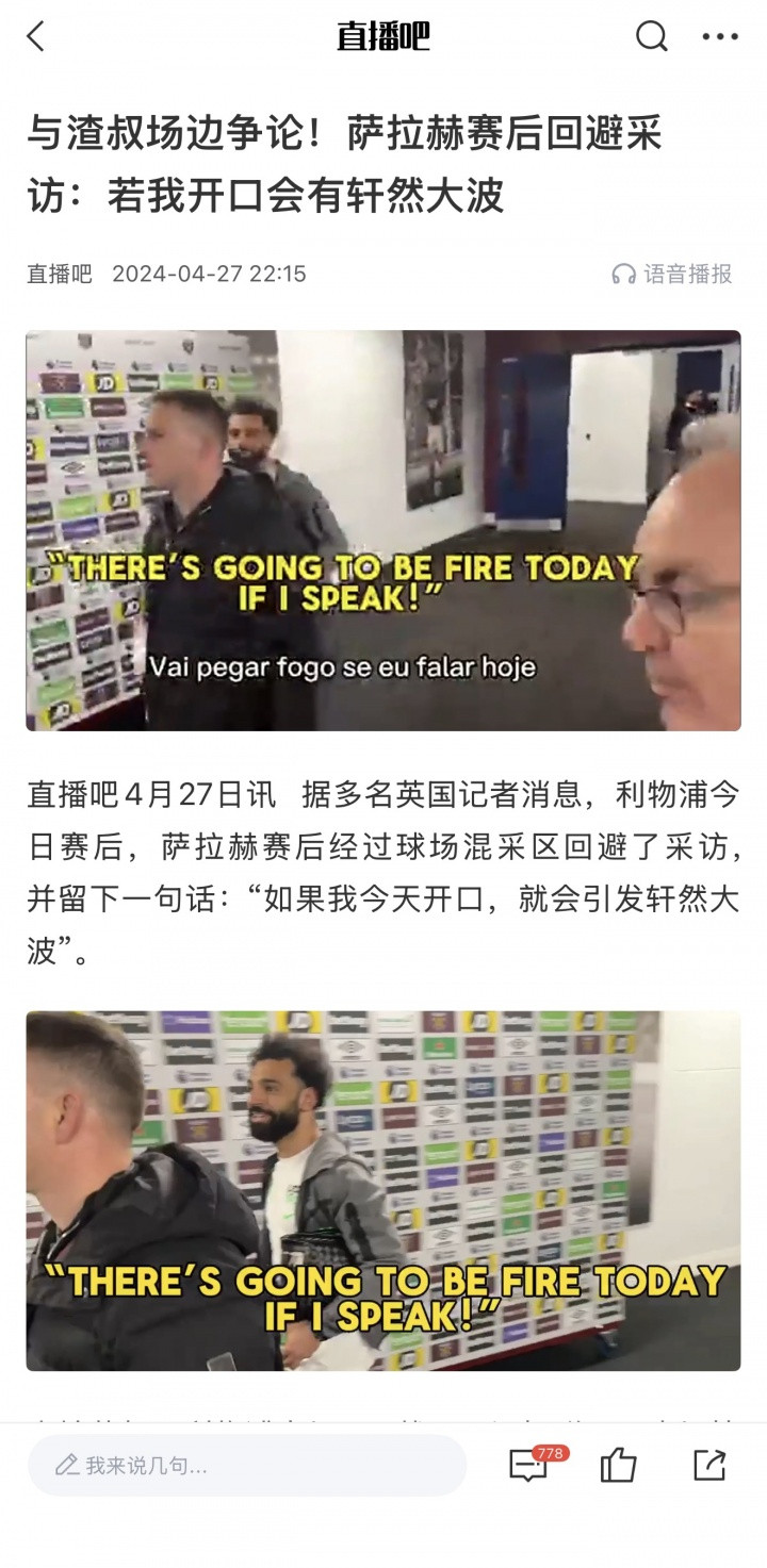 直播吧12月08日讯利物浦3-3利兹联赛后,萨拉赫途经混采区时主动吸收记者采访,随之而来的炮轰引爆了所有这个词足坛。