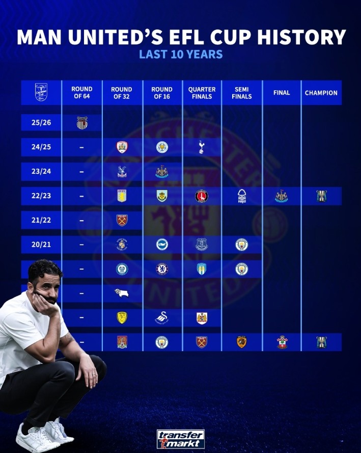 最近十年,曼联曾在16-17赛季以及22-23赛季得到该项赛事冠军,此前最差战绩是18-19赛季第三轮不敌德比郡,21-22赛季第三轮不敌西汉姆。