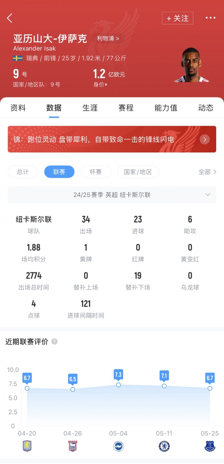 伊萨克现年25岁,瑞史籍先锋,生存曾先后服从AIK索尔纳、多特蒙德、威廉二世、皇家社会以及纽卡。上赛季他为纽卡出场42场,打进27粒进球并获利6次助攻。当今其德回身价为1.2亿欧。