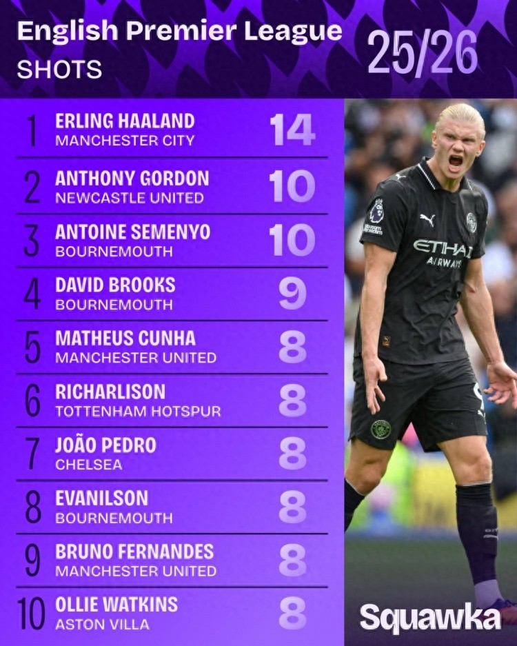 新赛季英超射门榜: 哈兰德14次居首, B费、库尼亚、佩德罗在列