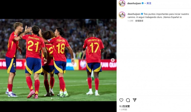他也在赛后通过社媒晒出和队友们庆祝的合照,并配文:“开启咱们(世初赛)旅程的重要3分。让咱们继续起劲。西班牙加油!”