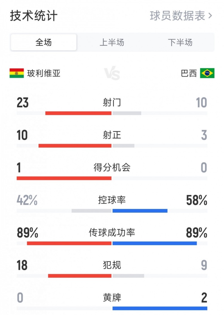 局面被迫,巴西0-1玻利维亚全场数据:射门10-23,射正3-10
