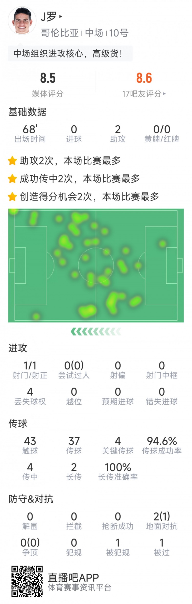 9月10日讯 在本轮南好意思区世初赛,哥伦比亚6-3打败委内瑞拉,J罗首发出战助攻双响,以下为他在本场数据: